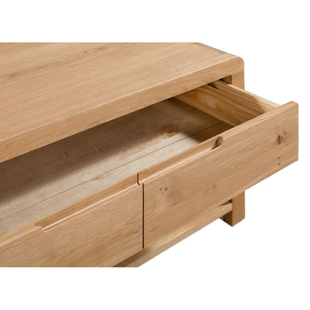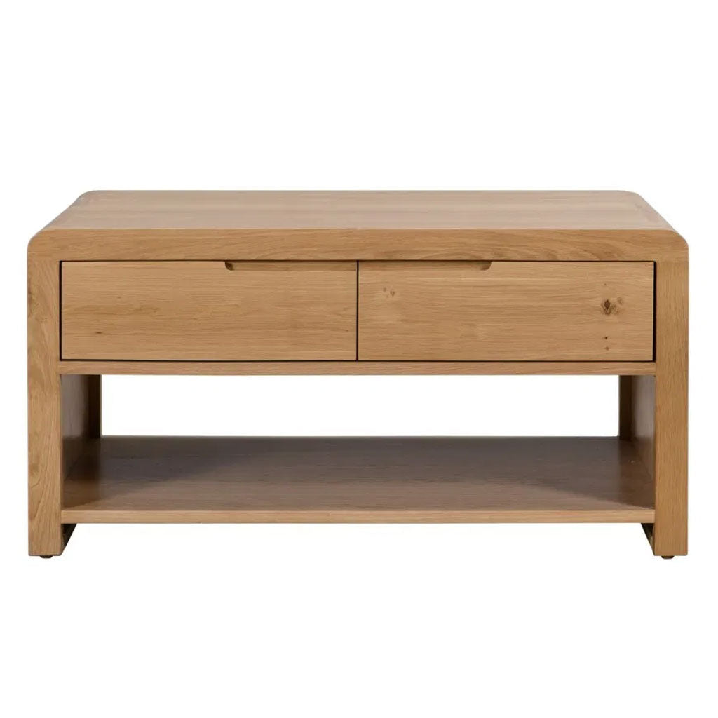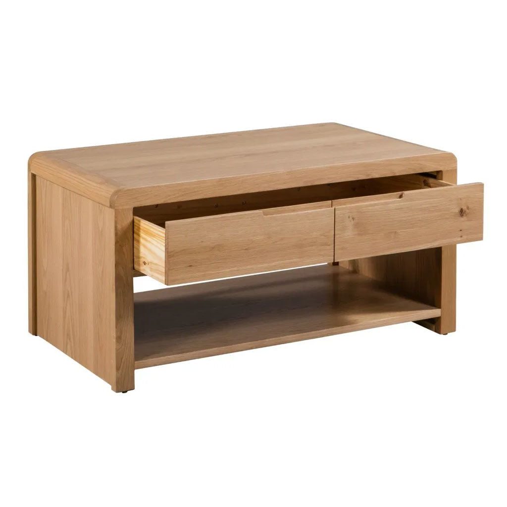 Bring timeless style and functionality into your living space with the Curve Wooden Coffee Table with 1 Drawer, available at CozyFurnitureDirect. Crafted from solid oak and oak veneers, this elegant piece showcases clean lines paired with the collection’s signature gentle curved edging, creating a modern yet retro-inspired finish. The table features one large spacious drawer, cleverly designed with the appearance of two smaller drawers on the outside, and a lower shelf for additional storage. Perfect for magazines, remotes, or decorative items, the Curve coffee table is both stylish and practical - an ideal centrepiece for UK homes.